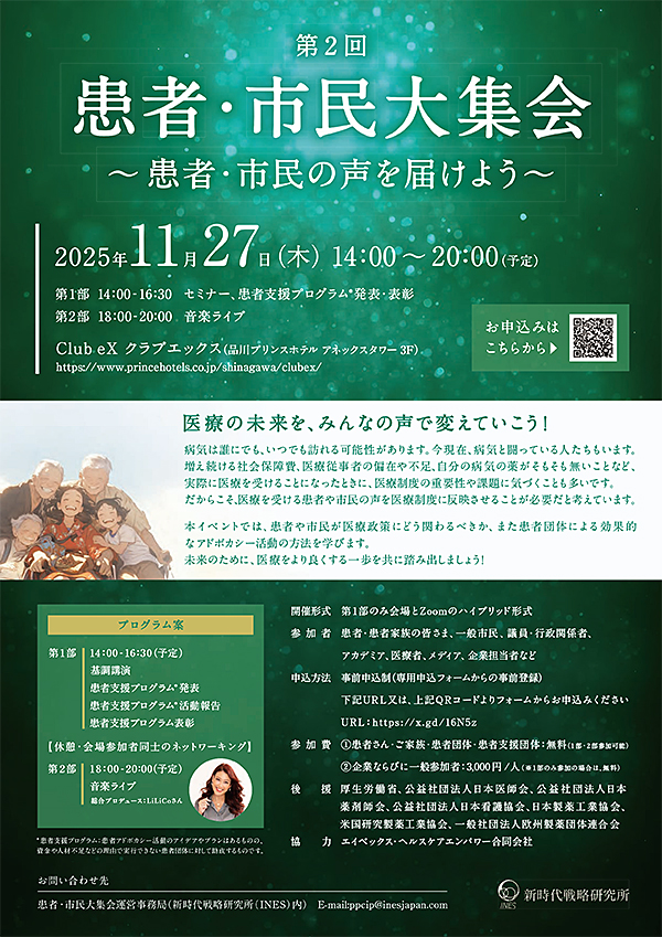 患者目線で革新的医療政策実現を目指すパートナーシップ(PPCIP)の活動母体である一般社団法人新時代戦略研究所(INES)は、2025年11月27日(木)に『第2回 患者・市民大集会 〜患者・市民の声を届けよう〜』を開催いたします。